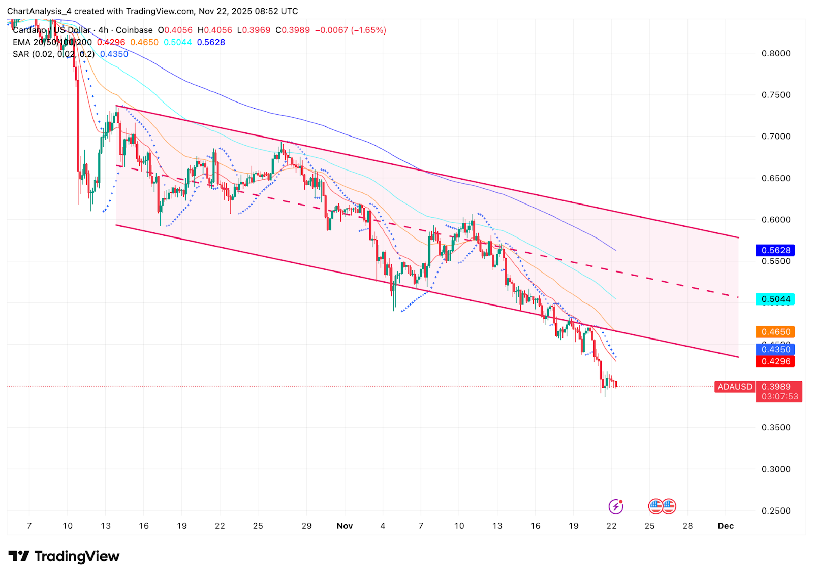 4小时图显示ADA交易价格低于下降通道。价格持续低于20、50、100和200周期均线,确认了持续的下跌结构。