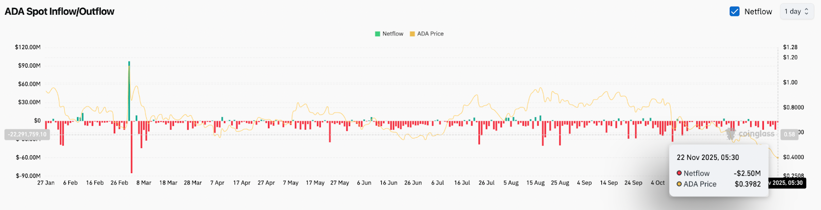 CoinGlass数据显示,过去24小时内ADA净流出资金达250万美元,延续了数周以来持续亏损的趋势。自10月初以来,ADA的资金流出天数已超过资金流入天数。