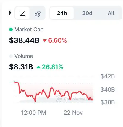 根据CoinMarketCap11月21日,整个表情包行业规模跌至384亿美元。