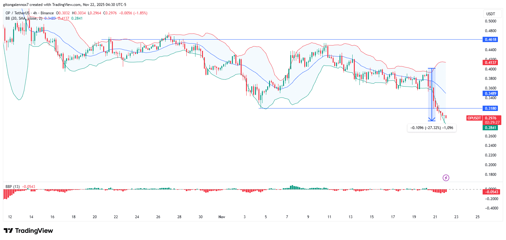 图表清晰地显示了空头占据主导地位。乐观主义 [OP]跌至新低,跌破 0.30 美元。