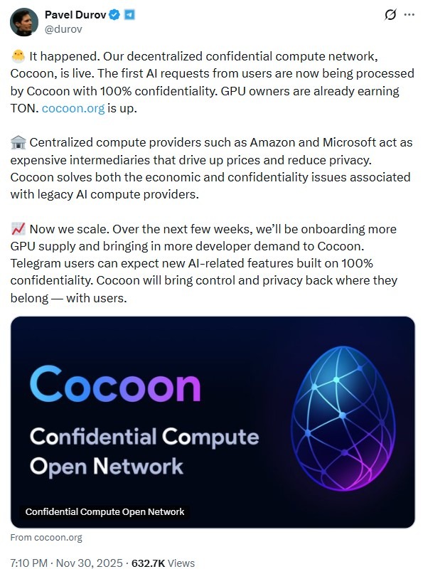 这Telegram创始人他向用户保证,Telegram团队将增加Cocoon的GPU供应和开发者需求。他还补充说,Telegram用户可以期待基于100%保密性构建的全新人工智能相关功能。
