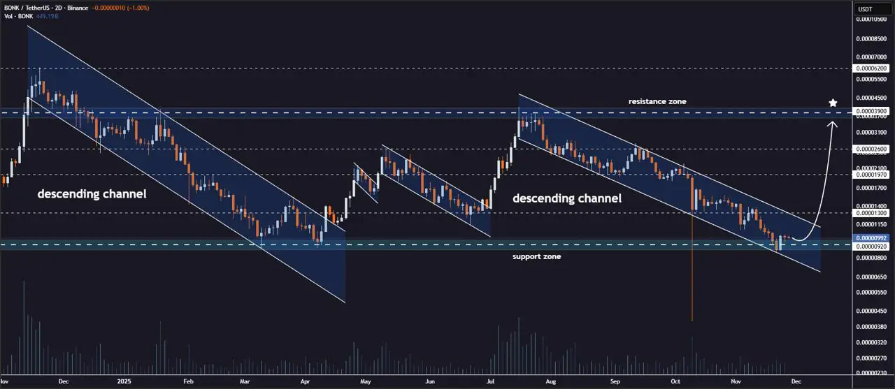 加密货币价格飙升。不过,他预计此次涨幅较小。如果这种趋势持续下去,仍有可能出现10倍的涨幅。XRP交易价格为2.04美元过去一天下跌了6.65%。BONK 继续在下降通道支撑位上方盘整。分析师 Jonathan Carter 指出,买家积极捍卫该区域。这种行为通常会导致中期突破。此外,市场结构显示出动能改善的迹象。精明的资金似乎正在增持。挥发性