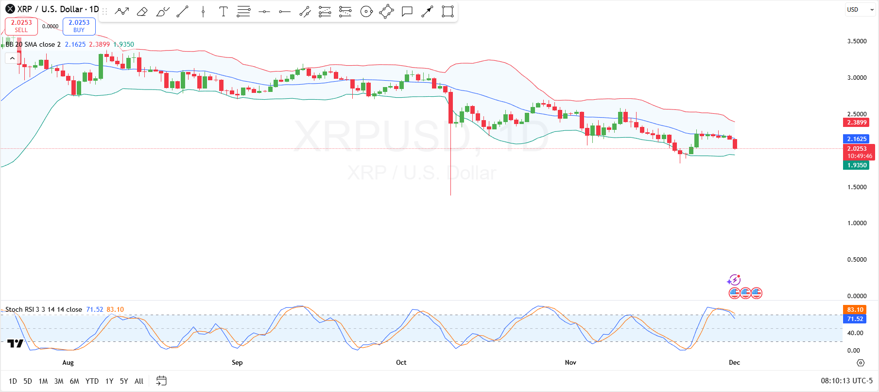 总体而言,XRP 的技术走势仍受 2.16 美元和 2.38 美元两层阻力位的制约,而 1.93 美元区域则构成主要支撑位。在 XRP 重新站上中轨并收于其上方之前,各项指标均表明空头压力依然占据主导地位。