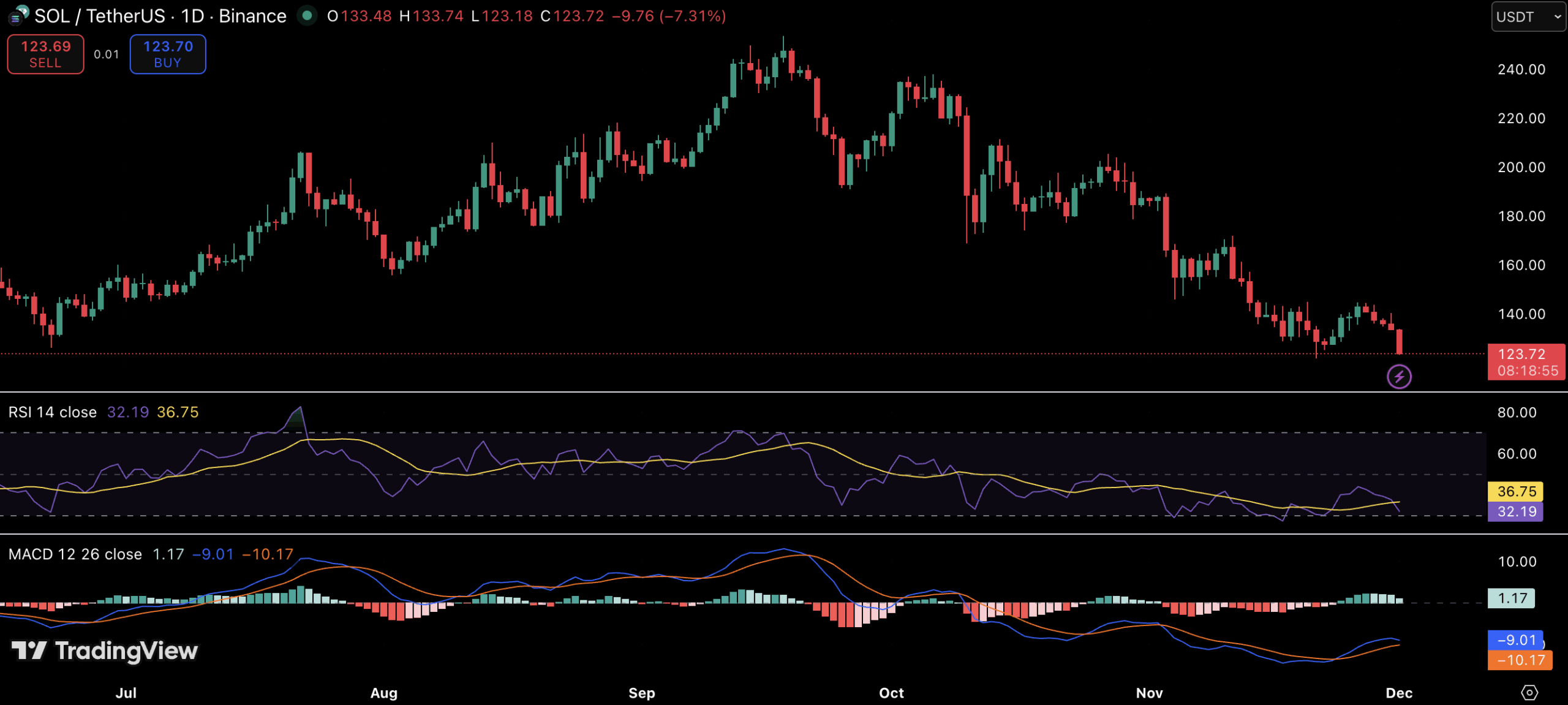 “>DEX以及应用程序活动。SOL股价在过去24小时内下跌超过10%,跌至约123美元,目前徘徊在关键支撑位附近,此前买家曾在此支撑位附近守住涨势。技术指标显示,当前正处于一个关键的成败区域,该区域可能决定下一步的走势。