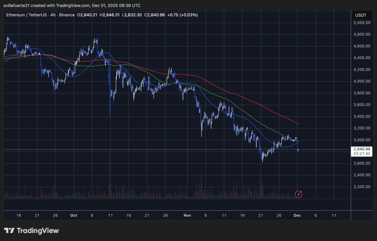 以太坊4小时图显示,在跌破3000美元关口后,市场仍在努力重拾上涨动能。整体结构依然明显看跌,价格低于50日均线、100日均线和200日均线,这清楚地表明卖方继续主导市场趋势。每次试图突破均线的尝试均告失败,进一步强化了始于10月下旬并延续至11月的下跌趋势。