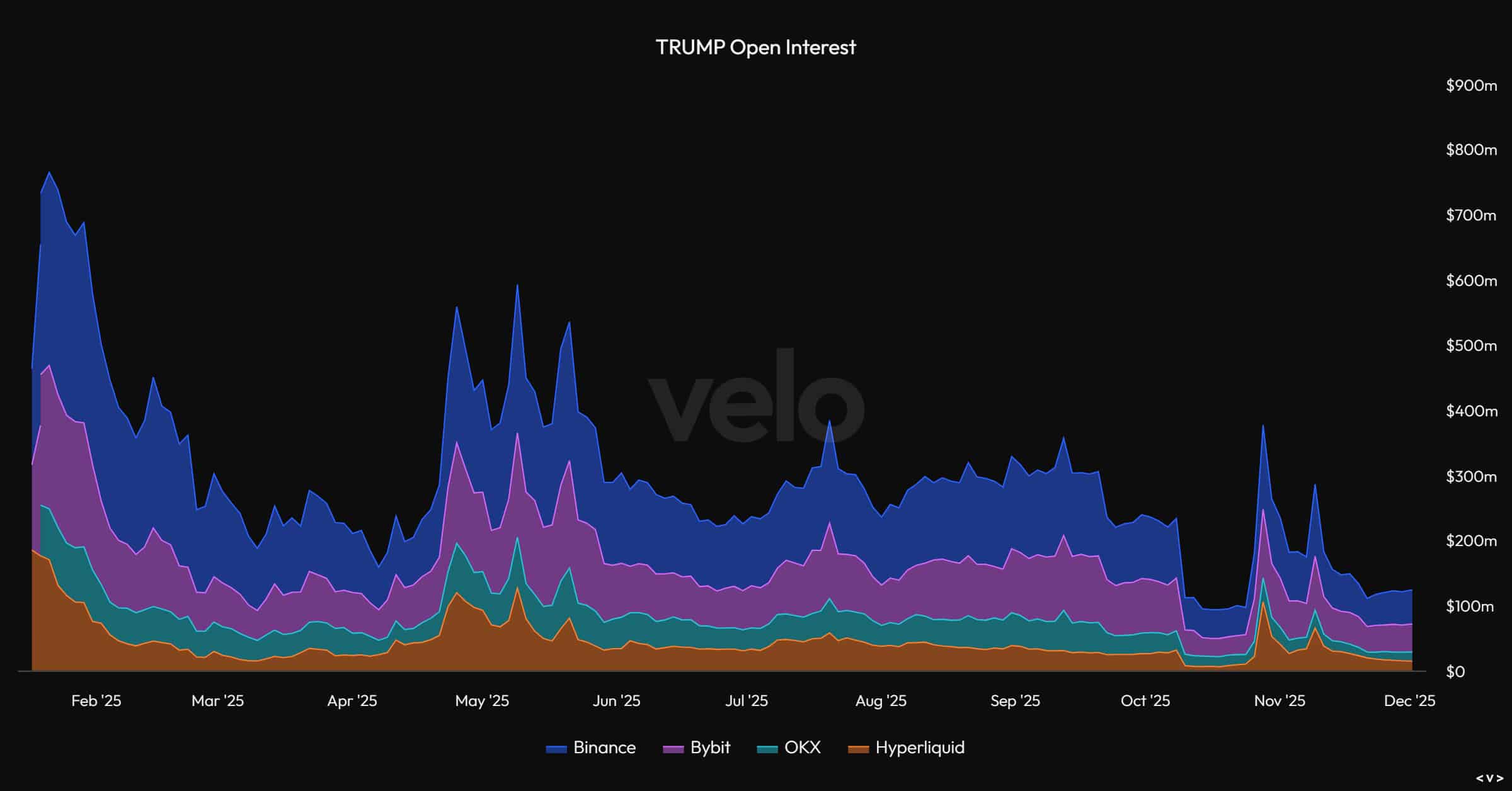根据Velo数据总未平仓合约 (OI) 从 2025 年初的 5.5 亿美元以上缩减至 12 月份的 1.2 亿美元。