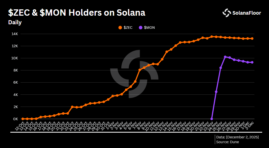持有者数量的增长凸显了其普及程度。Solana 上的 $ZEC 持有者钱包数量已超过 13.2 万个。$MON 的持有者数量在 3 天内突破 10.2 万个,目前已超过 9.3 万个。