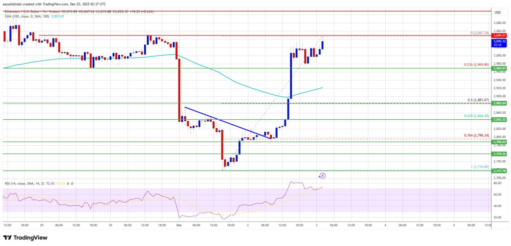 以太坊价格突破 2.92 美元,开始新一轮上涨。0. ETH 目前正试图突破 3,050 美元的阻力位,并可能加速上涨。