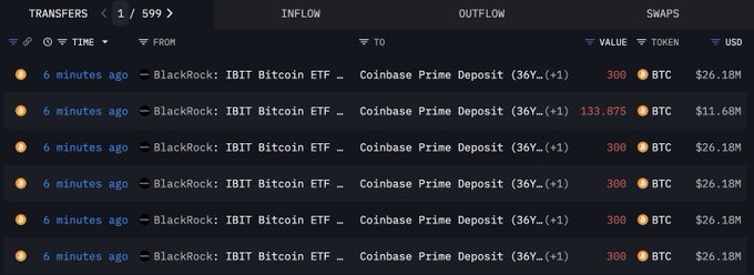 来自IBIT的数据比特币ETF钱包显示多笔快速转账流入 Coinbase Prime 存款账户。