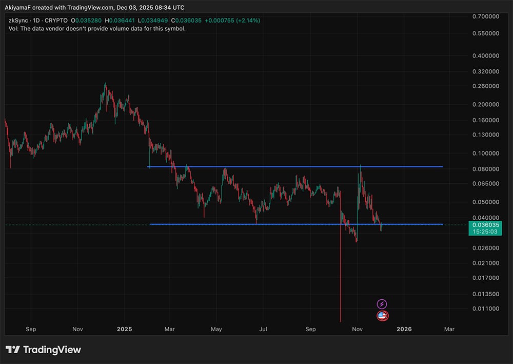 尽管如此,人们仍在试图从更乐观的角度看待这个问题。加密货币图表观察人士声称,zkSync 仍处于威科夫结构中,有望上涨至 0.50 美元至 0.70 美元区间。