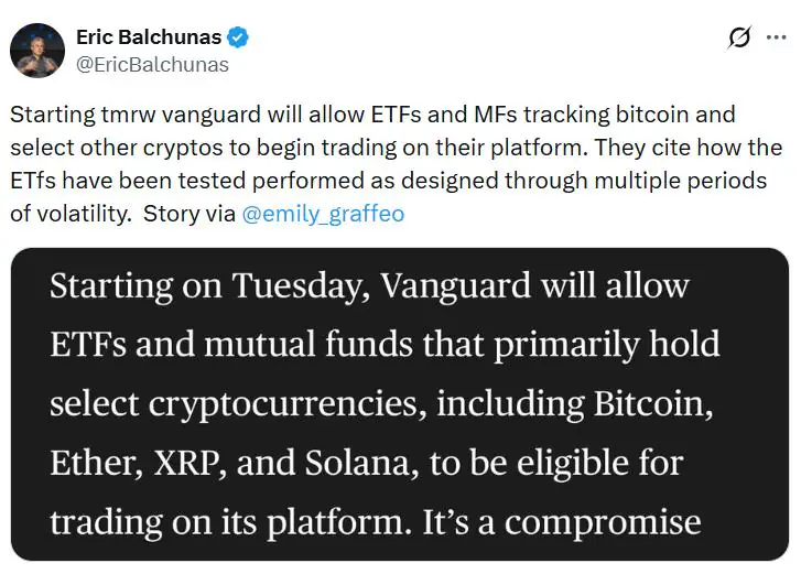 先锋集团改变了策略。这家管理着11万亿美元资产的资产管理公司,在多年拒绝加密货币之后,刚刚宣布将允许加密货币交易。ETF