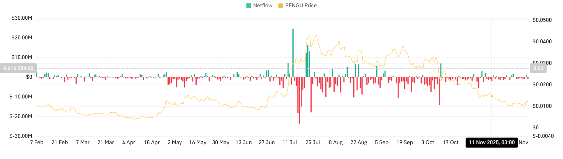 近期价格上涨主要是由于散户购买的重新活跃,因为市场降温后,PENGU 交易员又回来了。