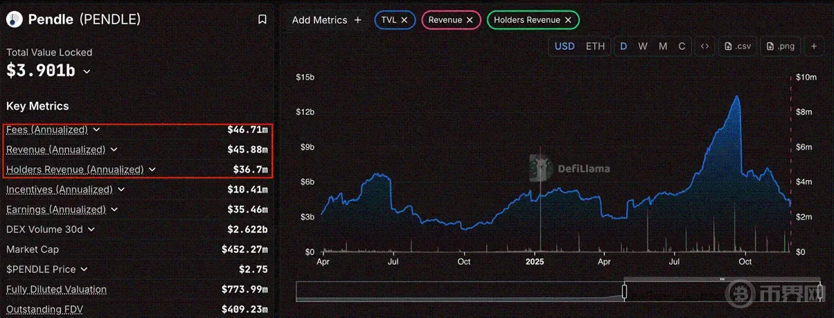 费用和收入概况Pendle 的核心业务是代币化收益并允许用户交易 PT/YT 对。根据 DefiLlama 今日数据: