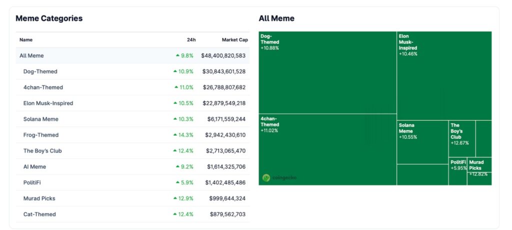 周三,随着比特币(BTC)价格重回93,000美元上方,表情包代币也随之上涨,带动整个板块走高。以青蛙为主题的表情包代币涨幅居榜首,高达14.3%,紧随其后的是Murad Mahmudov精选的表情包代币,涨幅为12.9%,而以男孩俱乐部(Boys Club)和猫为主题的代币均上涨了12.4%。