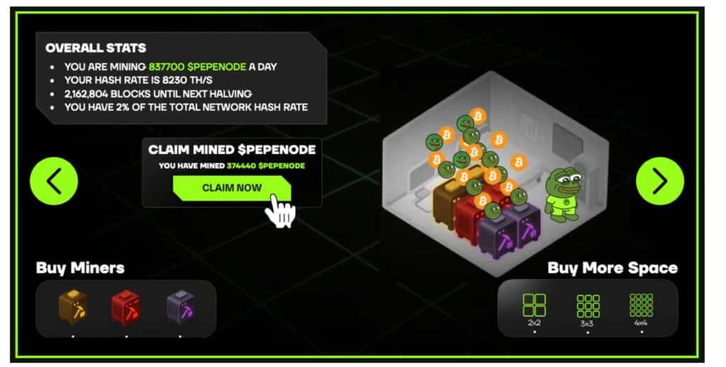 PepeNode 是第一个引入真正的挖矿赚取模因币模型的项目,它将传统的加密货币挖矿转变为虚拟策略游戏,玩家通过管理自己的数字挖矿操作来生成代币。