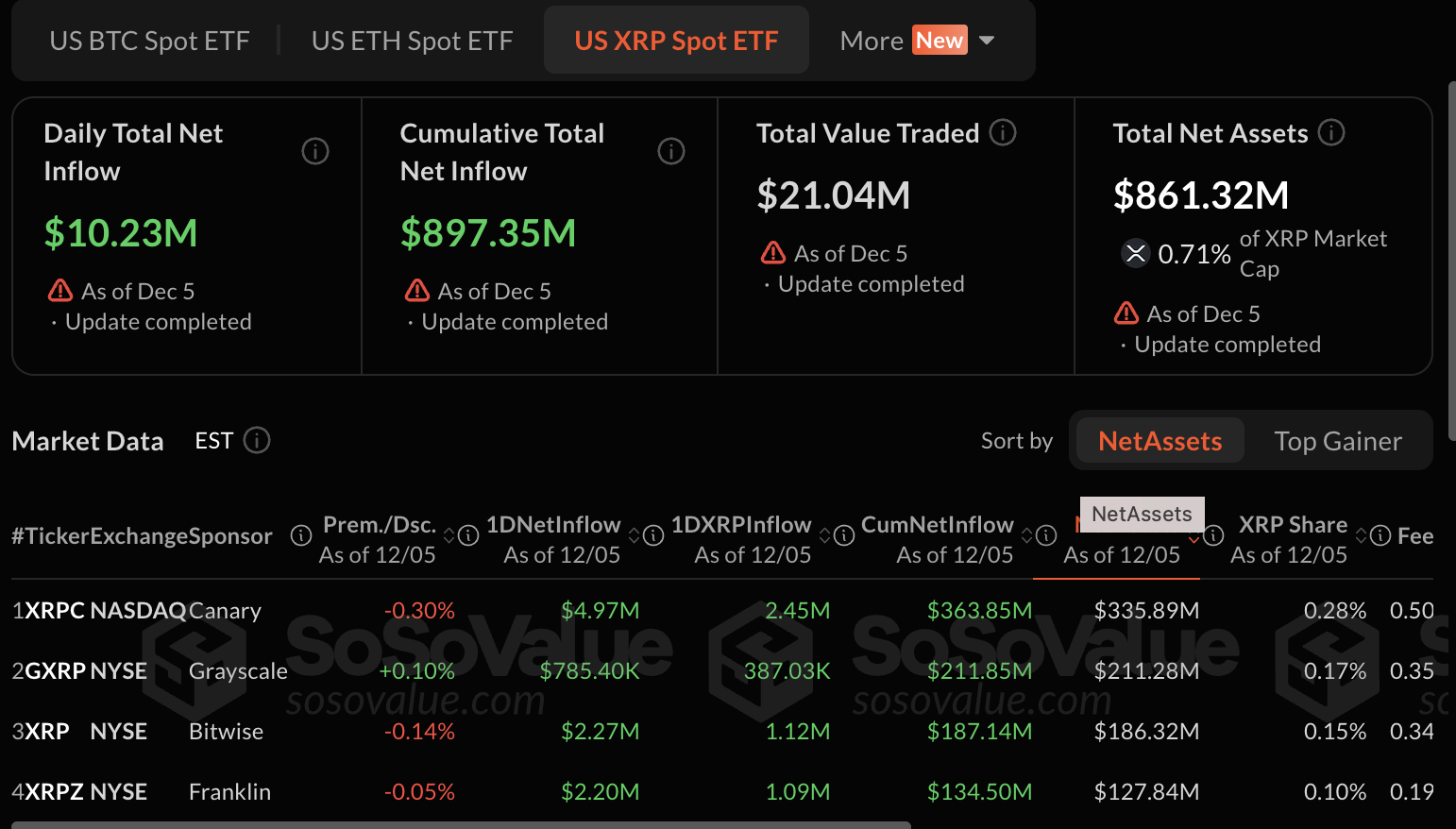 截至上周收盘,XRP ETF 已连续 15 个交易日吸引 8.97 亿美元资金流入。其中,Canary Capital 贡献了 3.6389 亿美元,Grayscale 旗下的 GXRP 贡献了 2.1185 亿美元。其他机构,例如 Bitwise 和 Franklin,也分别购入了价值 1.8714 亿美元和 1.345 亿美元的 XRP。