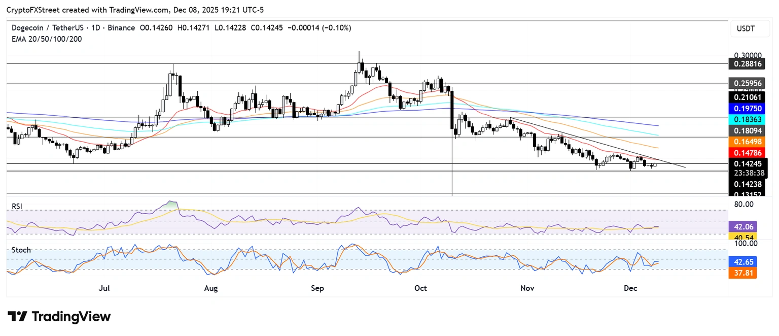 狗狗币正试图突破 0.142 美元关口,但它面临着一条始于 10 月 27 日的关键下降趋势线阻力。这条阻力线因 20 日指数移动平均线 (EMA) 而得到加强,自 10 月 10 日暴跌以来,狗狗币一直未能突破该均线并维持上涨。