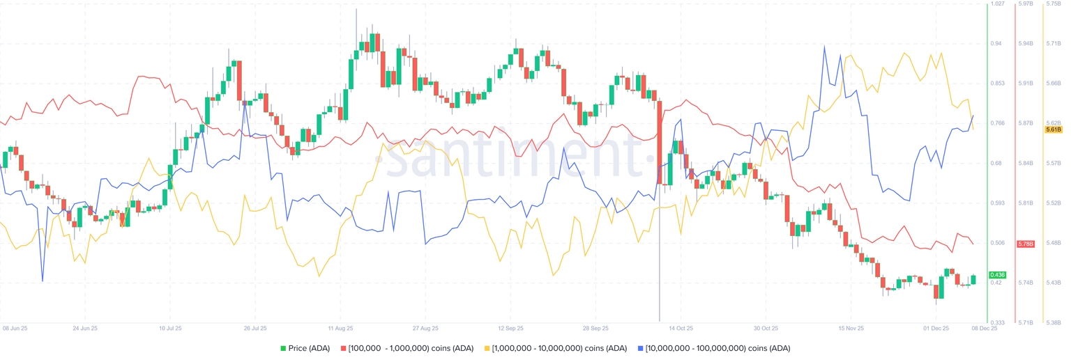 该指标显示,自 12 月 2 日以来,持有 1000 万至 1 亿 ADA 代币的巨鲸(蓝线)已积累了 1.6 亿枚代币。同期,持有 100 万至 1000 万 ADA 代币的钱包(黄线)已减持了 9000 万枚代币。