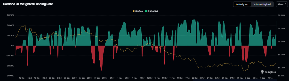 除了持有者不断增持之外,Coinglass 的 OI 加权资金率数据显示,押注 ADA 价格将进一步下跌的交易者数量低于预期价格上涨的交易者数量。