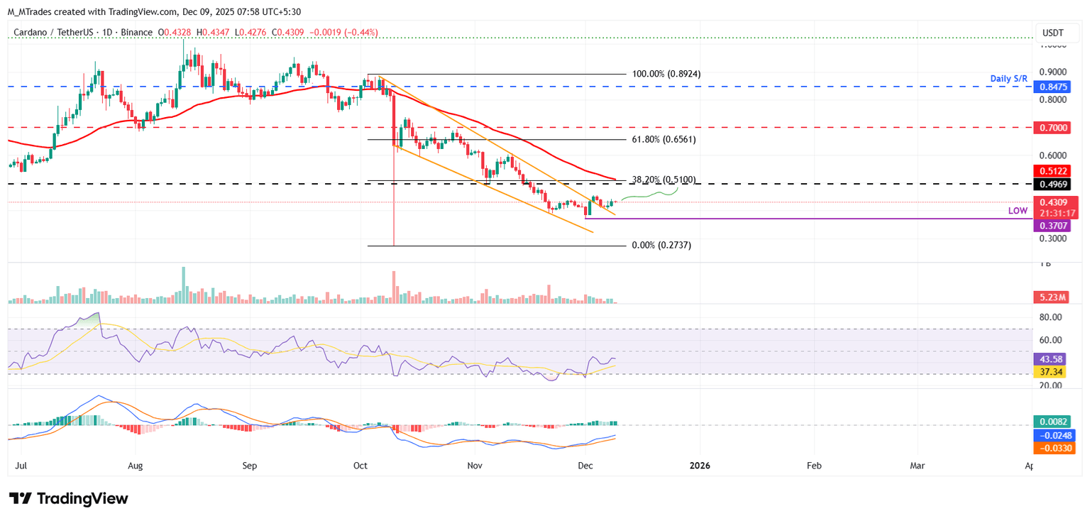 Cardano12月3日,价格突破了下降楔形形态(由两条趋势线连接多个高点和低点构成)。然而,上涨势头未能持续,随后回调并在上趋势线附近获得支撑。ADA周一上涨3.71%,截至周二发稿时,股价在0.43美元附近徘徊。