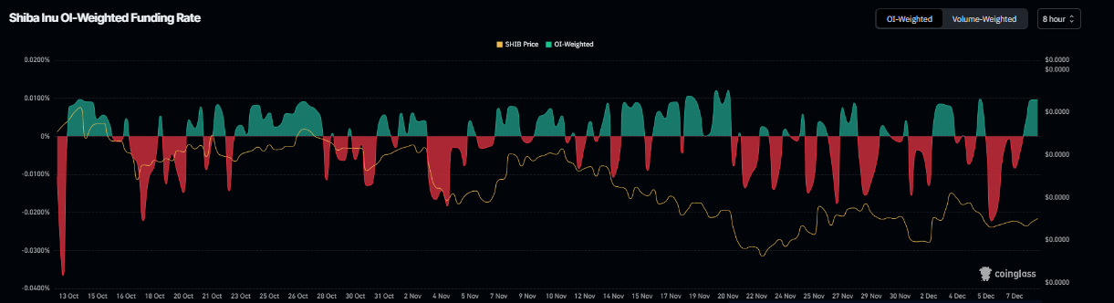 在衍生品方面,柴犬的融资利率数据也显示出复苏迹象。根据 Coinglass 的未平仓合约加权融资利率数据,押注柴犬股价将进一步下跌的交易员数量低于预期股价上涨的交易员数量。