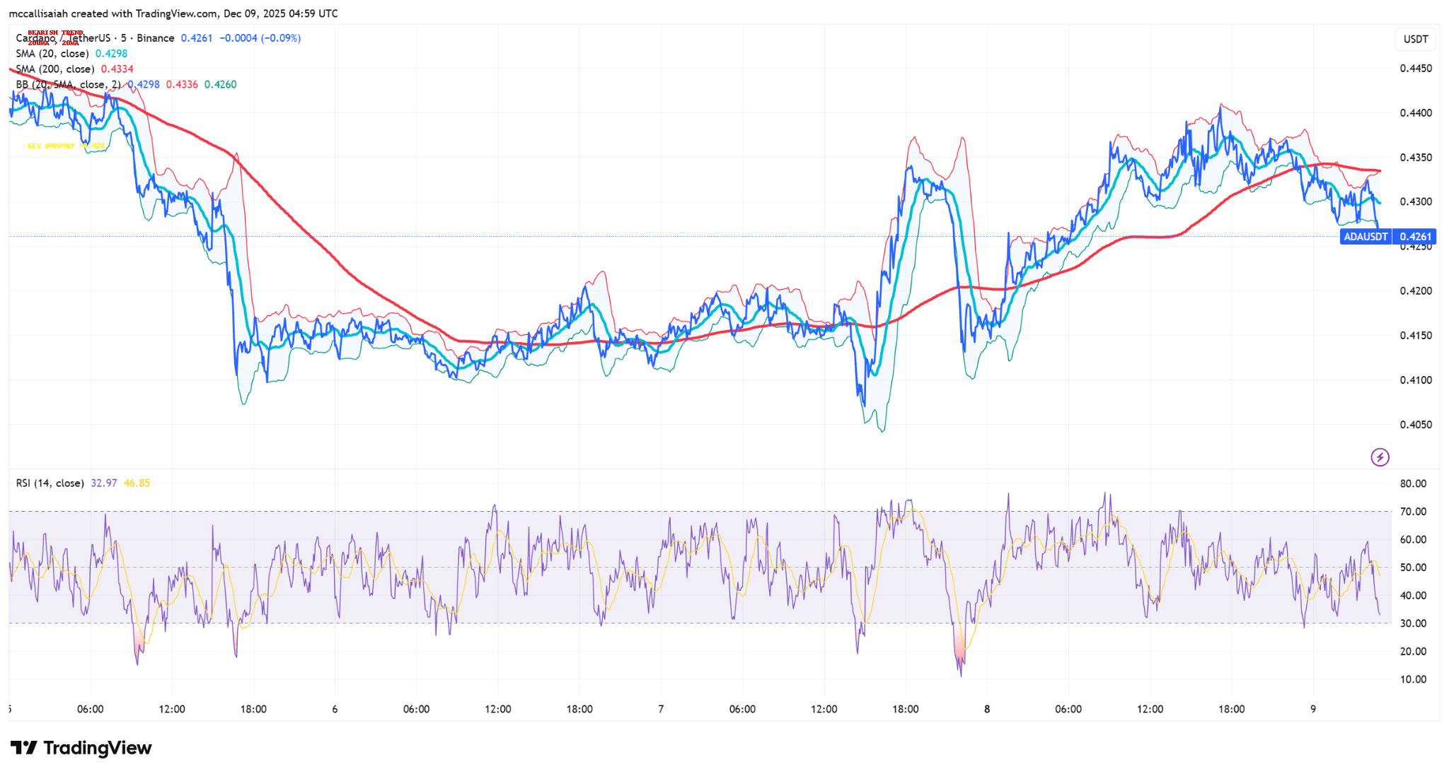 0.420 美元的支撑位曾多次守住,但每次反弹都逐渐减弱。若跌破该支撑位,目标位将指向 0.410 美元区域。阻力位依然稳固在 0.433 美元至 0.435 美元之间,200 日均线和上轨均在此区域阻挡了每一次反弹的尝试。