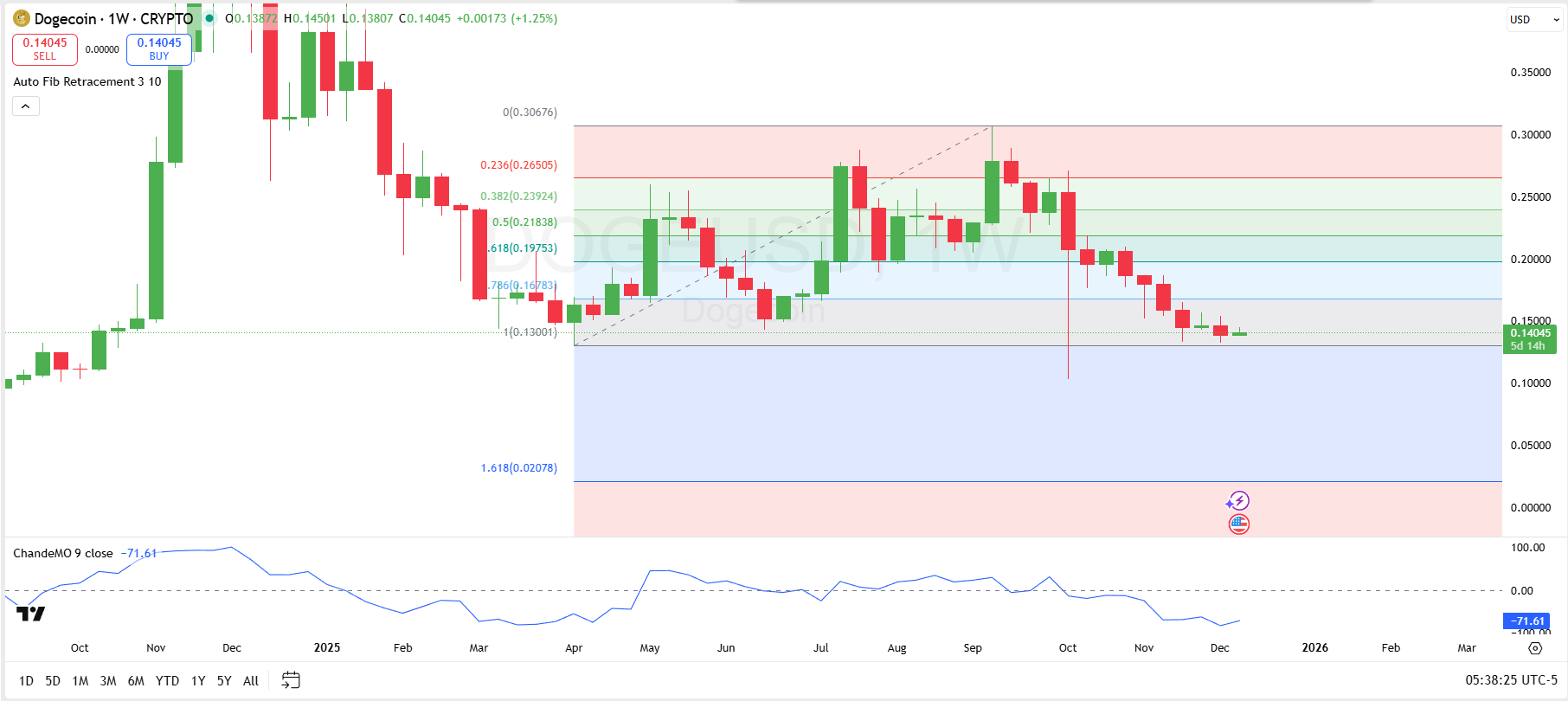 狗狗币价格在触及 0.30676 美元的峰值后回落至较低水平,斐波那契 1 度回调位 0.130 美元构成下一个强支撑区域。目前价格正朝着该支撑位移动,若反弹,则有望再次测试 0.168 美元上方的 0.786 斐波那契回调位。