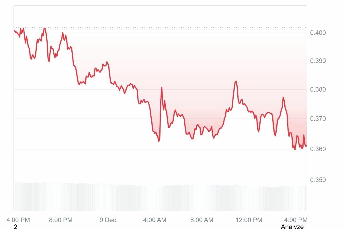 即便如此,卖方力量依然不容小觑。如果价格彻底跌破 0.36 美元,将削弱当前的支撑结构,并可能引发更深层次的回调。如果这种情况发生,价格可能会回落至 0.30 美元附近的未平仓区域。