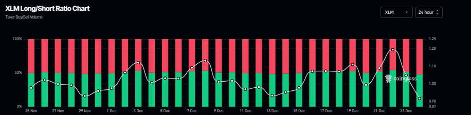 此外,Coinglass数据显示,XLM的多空比周三达到0.91,创一个月以来新高。该比率低于1表明市场看跌情绪浓厚,因为更多交易者押注XLM价格下跌。