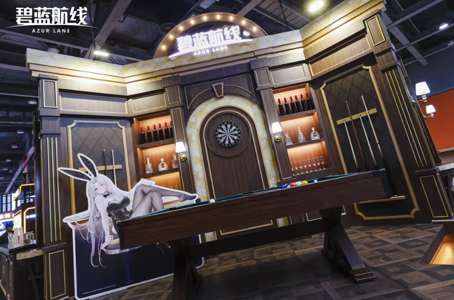 作为本次冬日快闪的第三站,《碧蓝航线》广州站快闪于2026年1月1日至3日在第37届萤火虫动漫游戏嘉年华上闪亮登场。不同于前两站的商场快闪形式,依托大型漫展平台,广州站快闪展区置景更加精致有趣——展台中央是一个复古风格的舞台,金色的边框与环绕的暖色灯泡,营造出华丽而温馨的氛围,舞台红色幕布背景上醒目的“AZUR LANE”霓虹字样,充满视觉冲击力。左侧的温馨吧台在迎接着每一位指挥官的到来,而右侧的休憩区域里,coser正为到来的指挥官上演欢乐互动。