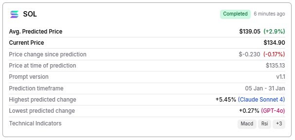 平均而言,这三个模型预测 Solana 的价格将在 1 月底达到 139.05 美元,较当前交易价格上涨 2.9%。Claude Sonnet 4 模型给出了最为乐观的预测,认为其价格可能上涨 5.45%,而 Gemini 2.5 Flash 和 ChatGPT 模型则分别预测其价格将上涨 3.15% 和 0.27%。