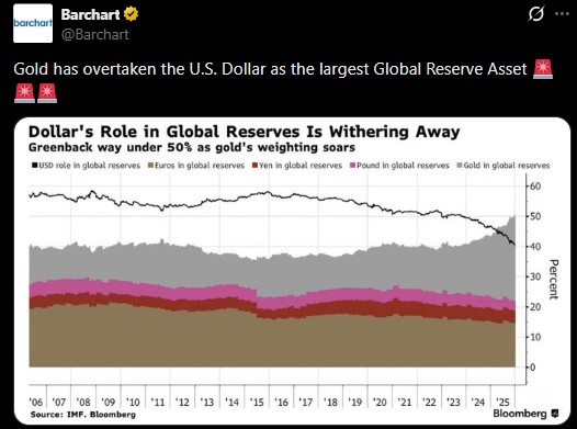 网上流传着这样的说法:黄金已经超越美元,成为全球最大的储备资产,尤其是在2026年初黄金价格飙升至每盎司4400美元以上之后。