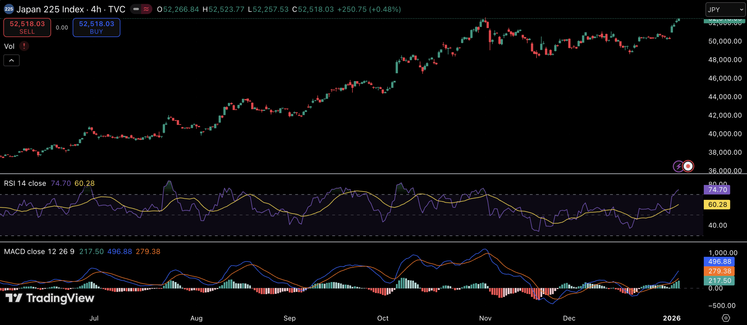 从技术角度来看,日经指数的突破伴随着强劲的动能信号。该指数目前在52500点附近交易,稳守在前期高点附近的阻力位上方。