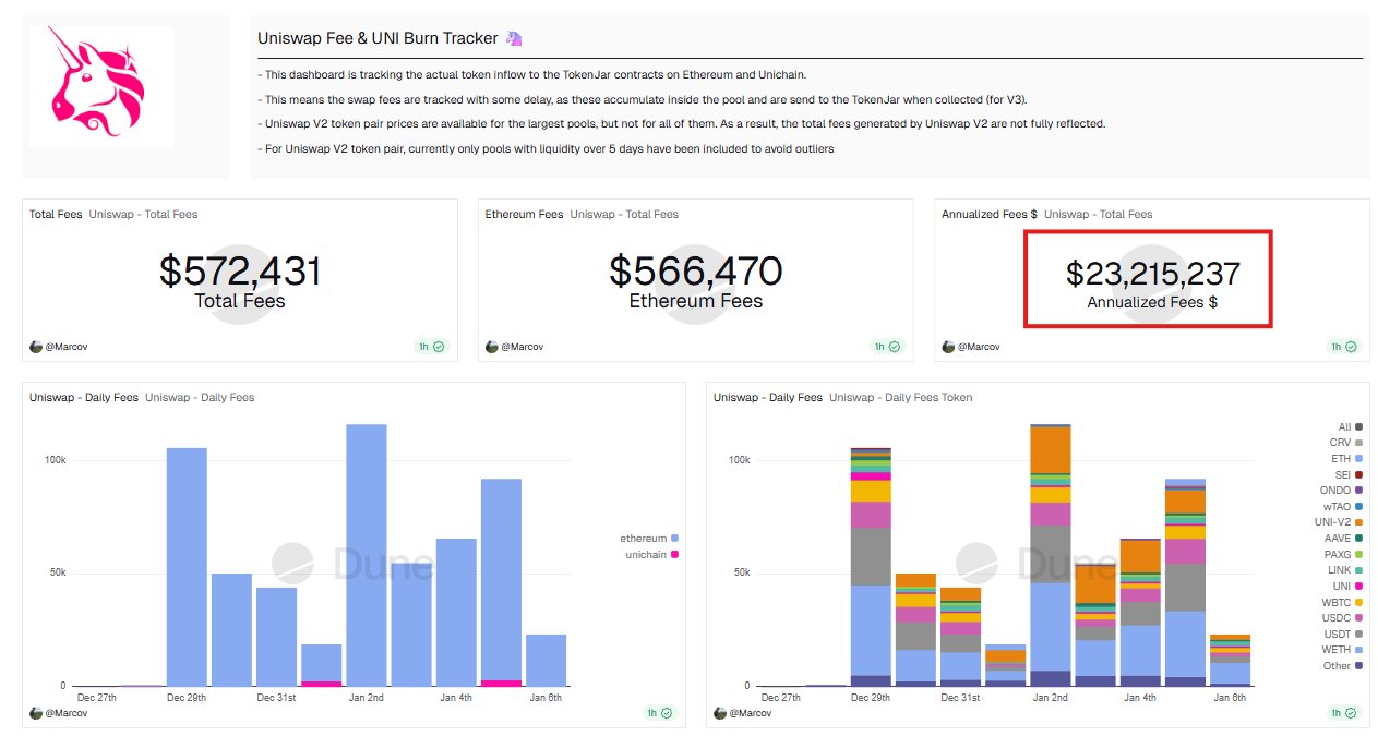 其他因素也在影响UNI的发展轨迹。据Dune Analytics的数据显示,Uniswap在费用转换后的年化费用总额为2300万美元,约为其54亿美元最终交易价值(FDV)的240倍。