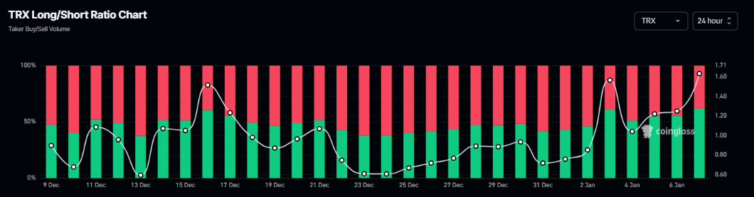 除了稳定币交易活跃度和市值不断攀升之外,Tron 的衍生品数据也预示着价格可能出现上涨。Coinglass 数据显示,TRX 的多空比周三达到 1.60,创下一个月以来的新高。该比率高于 1 表明,更多交易者押注 TRX 价格上涨。