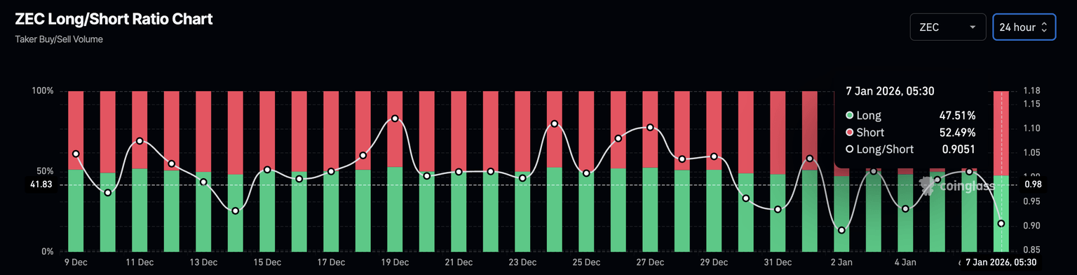 在衍生品方面,隐私币ZEC正失去散户信心,CoinGlass数据显示空头头寸增加,而交易员则在限制资金敞口。周三,ZEC期货未平仓合约(OI)为9.8642亿美元,低于前一日的11.1亿美元,表明交易员要么正在撤资,要么正在减少持仓。杠杆作用减少接触。