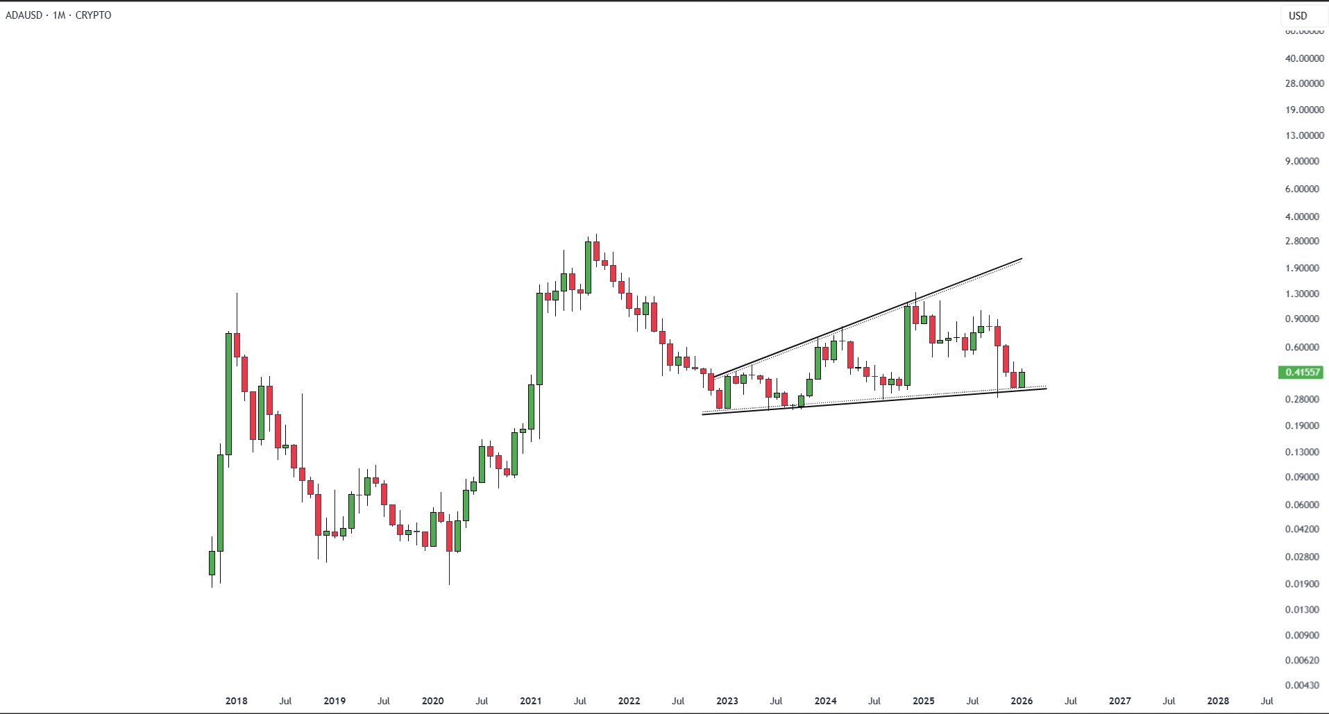 X评论方面,交易员兼市场分析师Anup Dhungana表示:各州Cardano 目前在月线图上处于上升楔形形态内盘整。