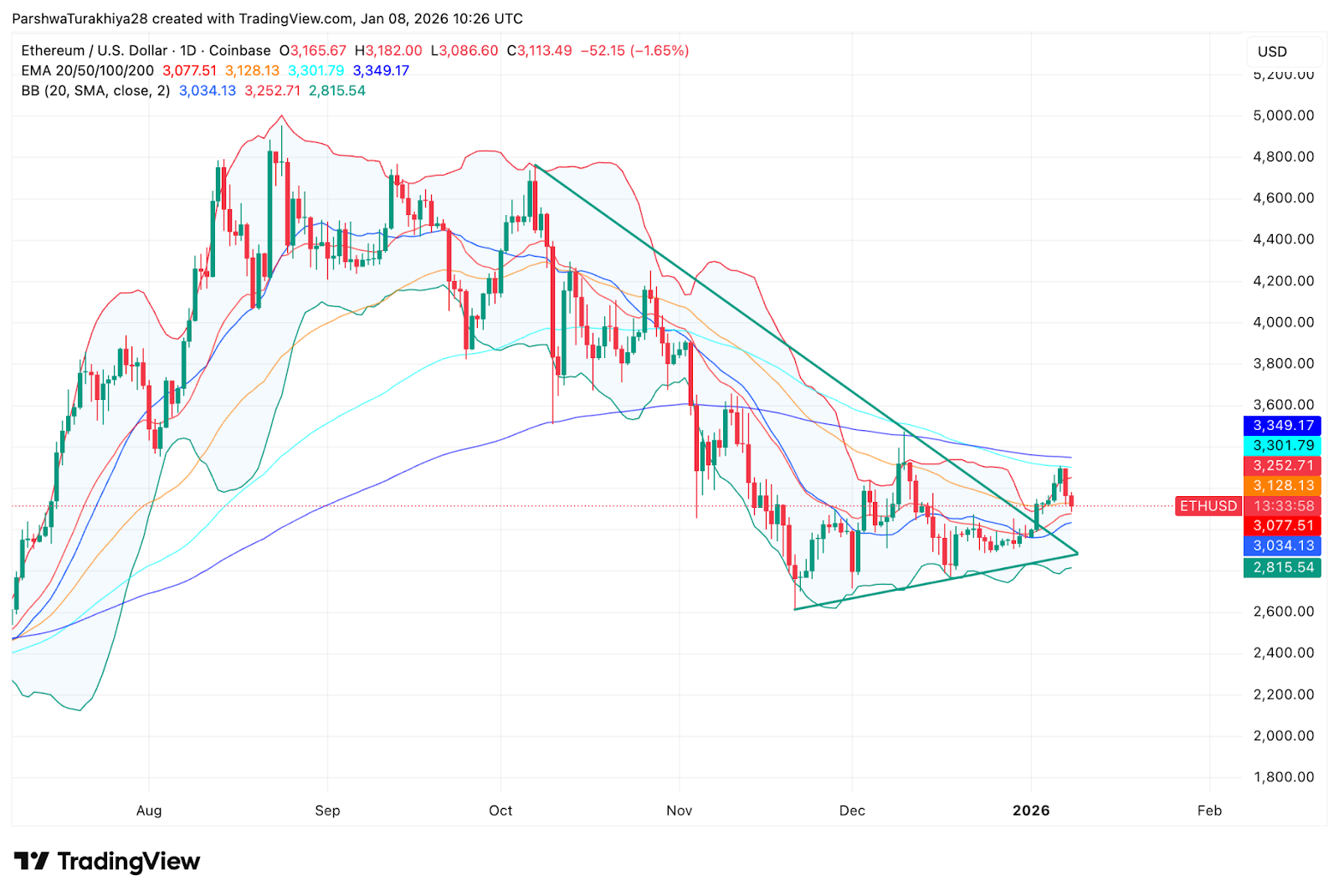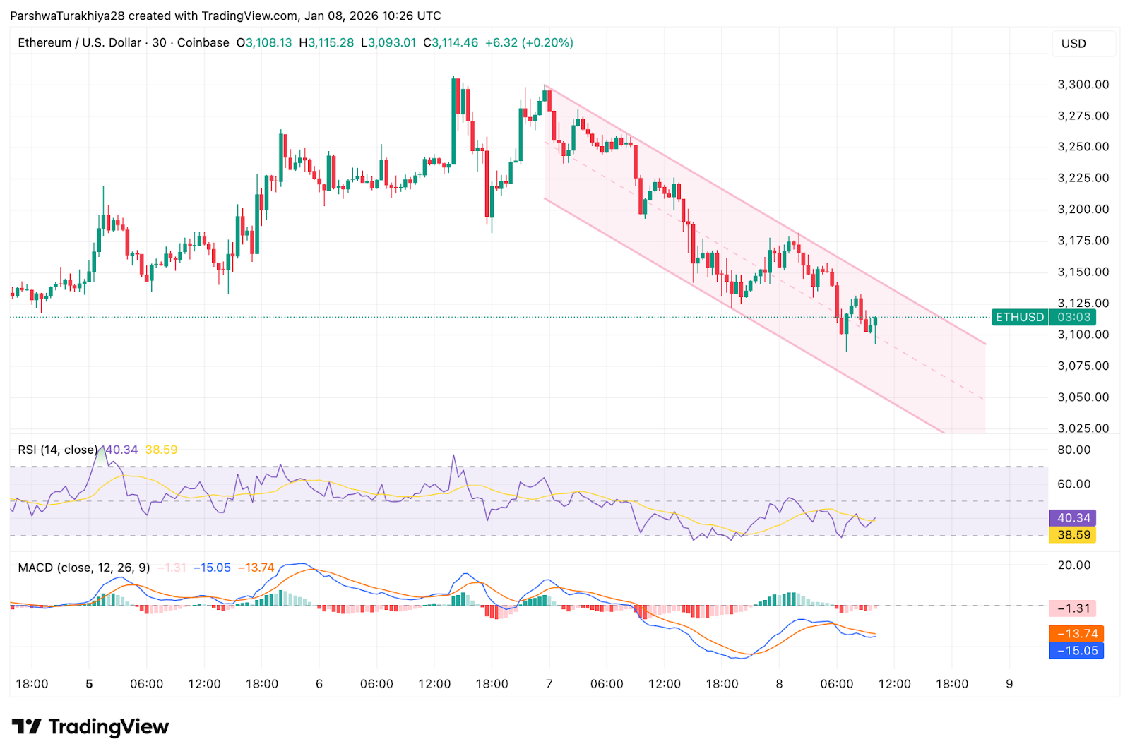 以太坊今日价格在 3115 美元附近交易,小幅下跌,此前该价位在 1 月初的反弹势头未能延续。在较低时间框架内,价格仍被困于下降通道中;而日线图显示,以太坊价格在关键移动平均线下方挣扎,尽管长期机构信号有所改善,但卖方仍占据主导地位。