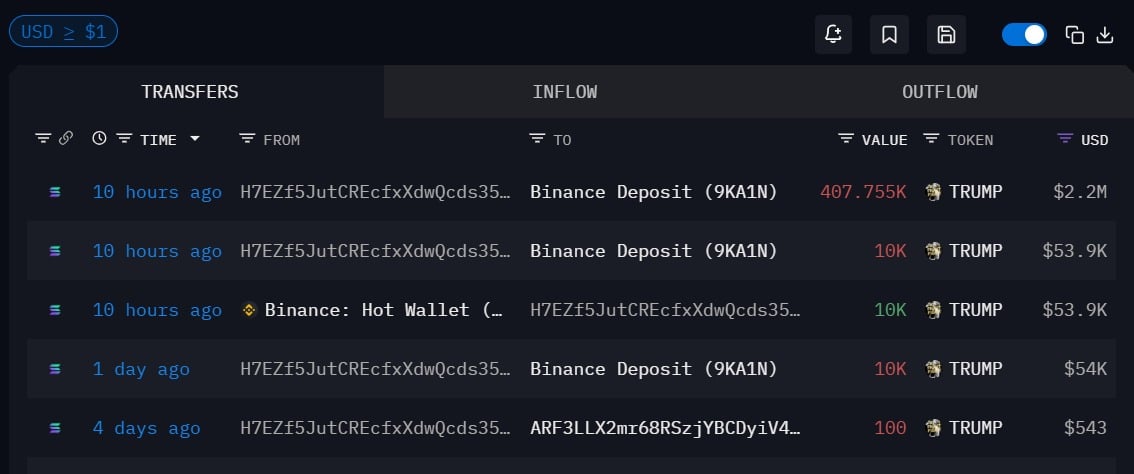 这位巨鲸在币安存入了价值 235 万美元的 43.7 万枚 TRUMP 代币。这些代币的购入价为 470 万美元,而最近的抛售使这位巨鲸损失了 235 万美元。