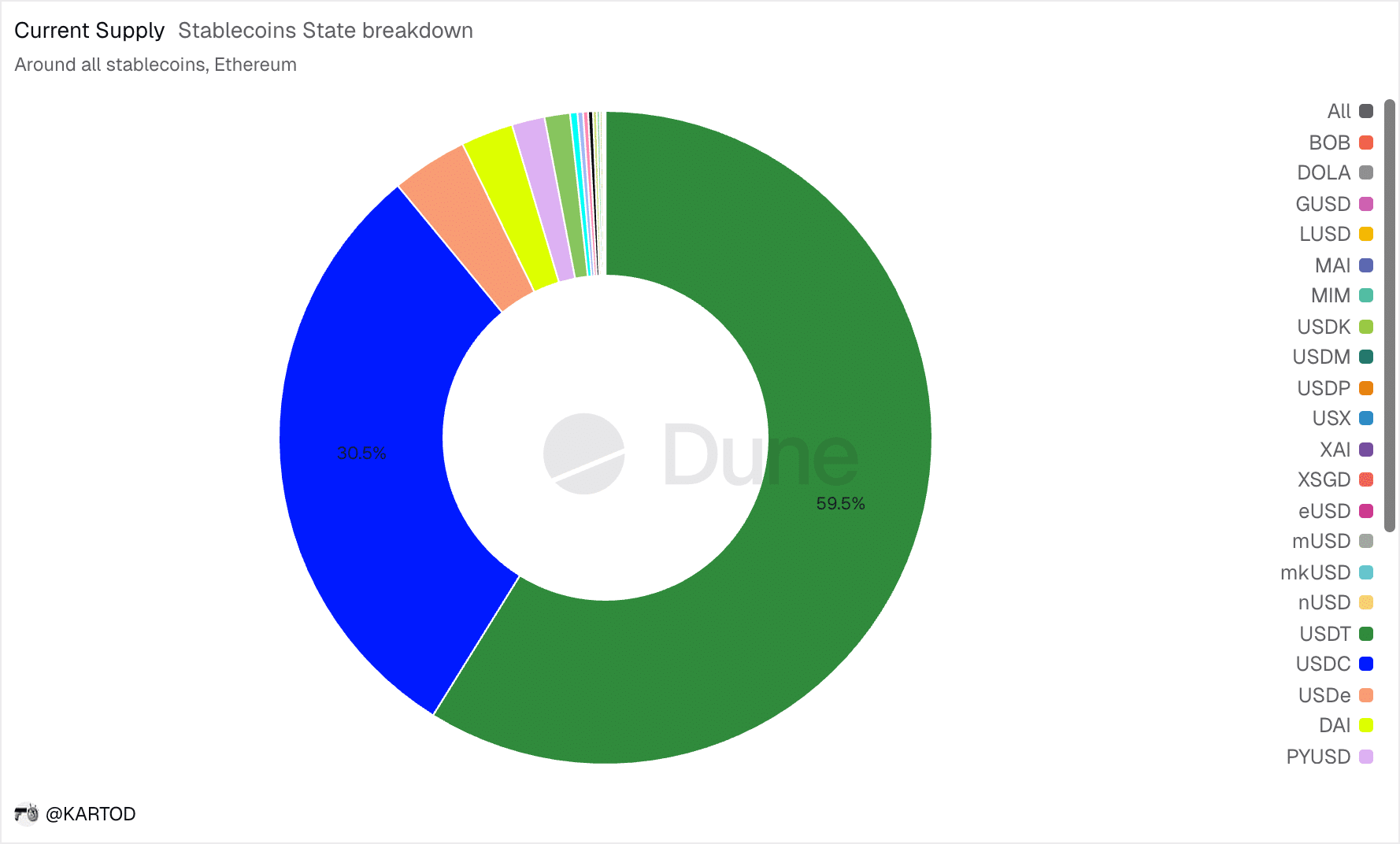 在以太坊上,USDT 和 USDC 占流通稳定币供应量的近 90%。, 根据沙丘分析数据。这进一步巩固了它们作为加密货币交易和结算主要美元通道的地位。