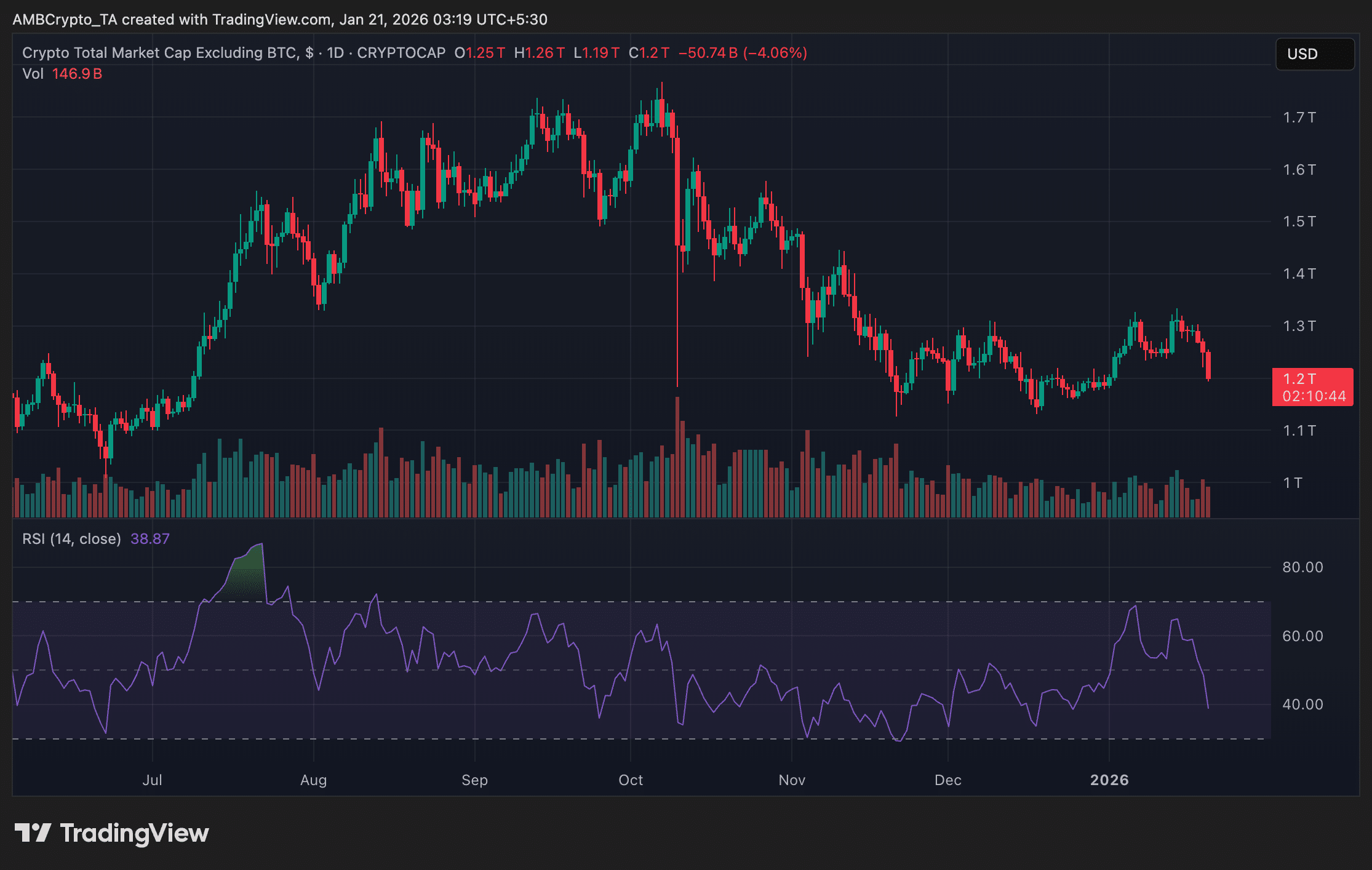剔除比特币后的总市值图表显示出明显的结构性丧失。在未能挽回颓势后……1.3万亿美元本月初,市场出现回调,并持续创出更低的高点,最近一次下跌将价格推向了 2024 年年中以来的最高水平。